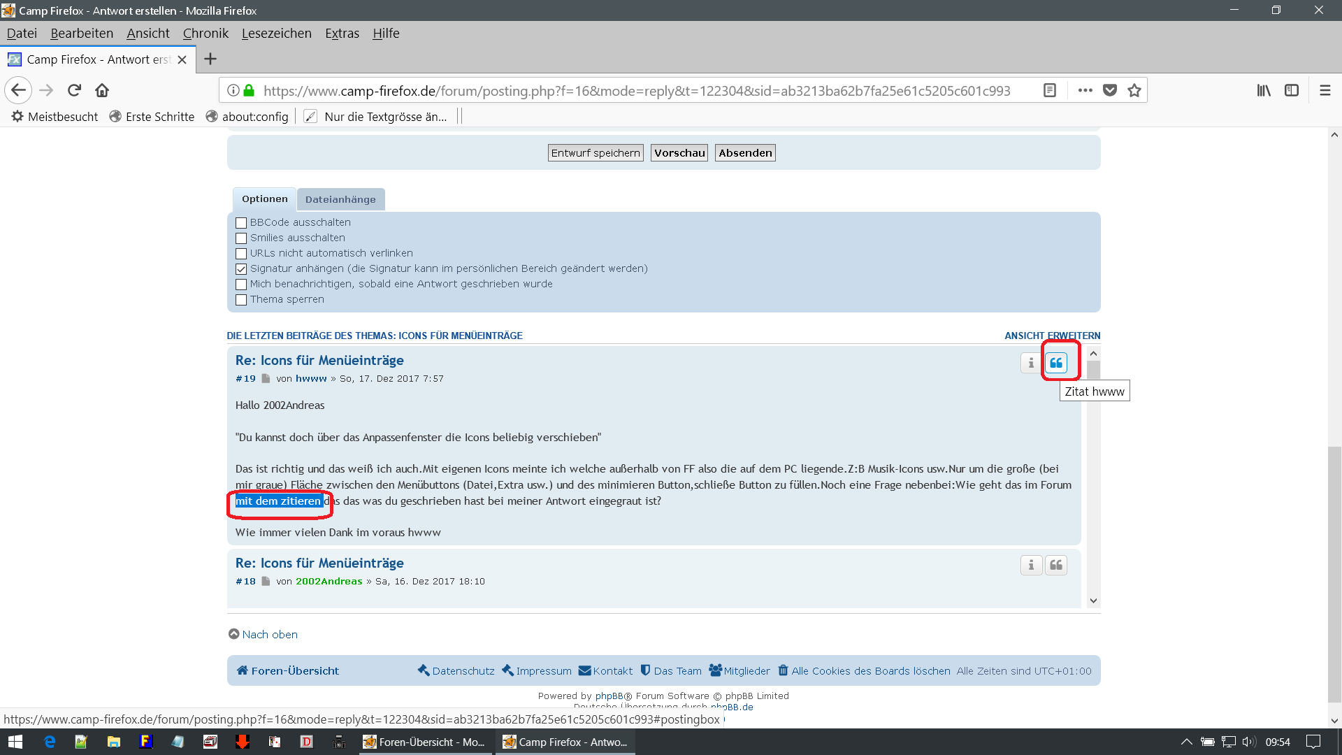 Das ist richtig und das weiß ich auch.Mit eigenen Icons meinte ich welche außerhalb von FF also die auf dem PC liegende.Z:B Musik-Icons usw.Nur um die große (bei mir graue) Fläche zwischen den Menübuttons (Datei,Extra usw.) und des minimieren Button,schließe Button zu füllen.Noch eine Frage nebenbei:Wie geht das im Forum mit dem zitieren das das was du geschrieben hast bei meiner Antwort eingegraut ist?