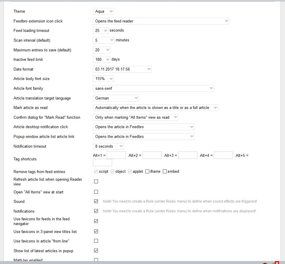 Was mir nun auffällt ist, dass Feedbro die Einträge beim Start nicht aktualisiert, obwohl ich "Refresh article list when opening Reader view" aktiviert habe. Wenn ich über das Kontext-Menü "Update Feeds in Folder" auswähle, klappt die Aktualisierung - aber dies müsste ich manuell für alle Ordner machen. Das ist nicht praktikabel. Übersehe ich etwas?