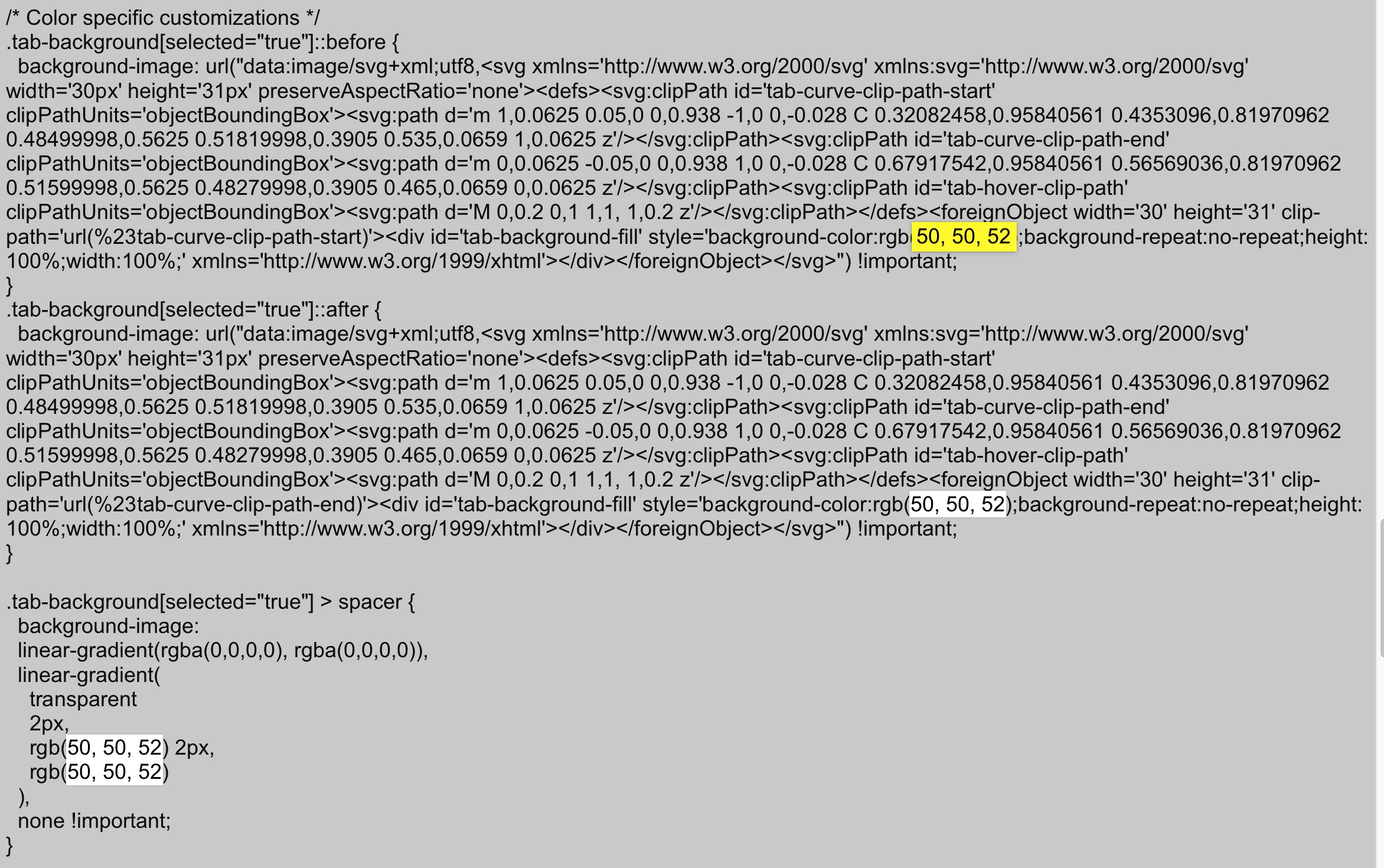 An den Farbwerten liegts nicht, ich weiß, welche ich benutzen möchte. Die Frage ist bloß, welche bzw. wo die zu finden sind? ;) Wie gesagt, ich finde den Abschnitt, den du gepostet hast, nirgendwo im Code.