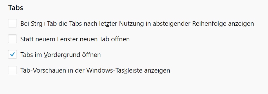 vielen Dank für Antwort. Die Einstellungsmöglichkeit "Tabs statt Fenster öffnen" finde ich unter "Einstellungen / Allgemein / Tabs" nicht - muß ich da woanders suchen?