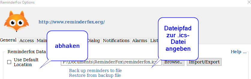 Insofern müsstest du nur dafür sorgen, dass die .ics im richtigen Profilordner von Thunderbird landet bzw. über Options in ReminderFox statt dem Profilordner den Ort angeben, wo die Datei zu finden ist.