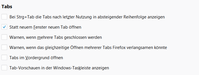 unter Einstellungen "Tabs" steht die Bezeichnung "Tab-Umgebungen aktivieren" und ein Haken.