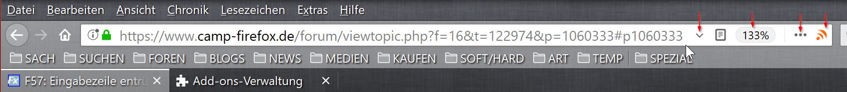Ich war wohl etwas zu rigoros beim Ausmisten der Eingabezeile und habe den Stern für das Speichern von Bookmarks entfernt. Es war zu einfach, einfach zurück mit ihm ins Anpassenfenster (glaube ich wenigstens, wenn ich mich recht erinnere).