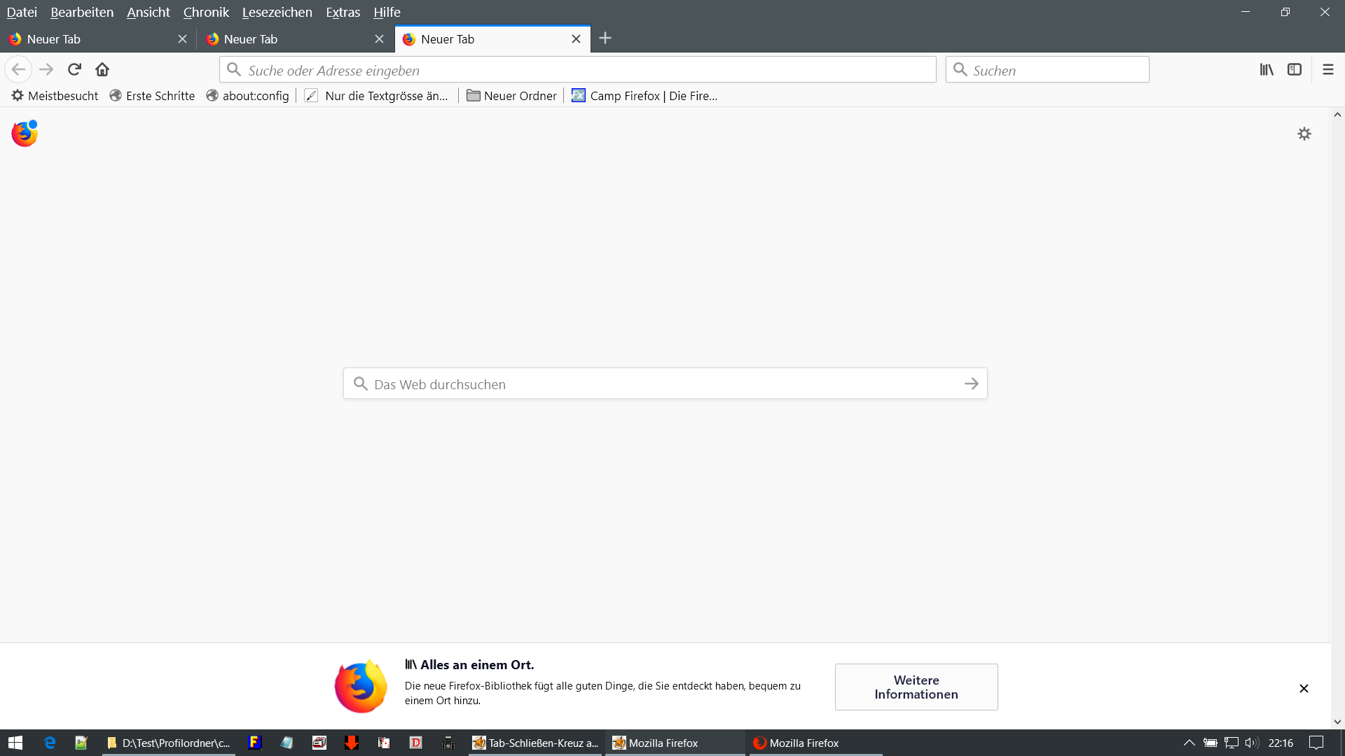Ich würde auch gern in jedem Tab das x zum Schließen des Tabs sichtbar machen. Leider hat browser.tabs.closebuttons in about:config den Wert auf eins zu setzen nichts bewirkt und der oben genannte CSS Code hat auch nicht die gewünschte Wirkung erzielt. Kann es sein das dies verursacht wird das ich mittels CSS die Tabs wie früher auf unter die Adressleiste gelegt habe?