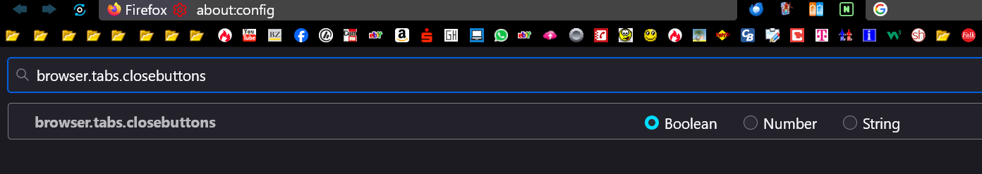 Ich würde auch gern in jedem Tab das x zum Schließen des Tabs sichtbar machen. Leider hat browser.tabs.closebuttons in about:config den Wert auf eins zu setzen nichts bewirkt und der oben genannte CSS Code hat auch nicht die gewünschte Wirkung erzielt. Kann es sein das dies verursacht wird das ich mittels CSS die Tabs wie früher auf unter die Adressleiste gelegt habe?