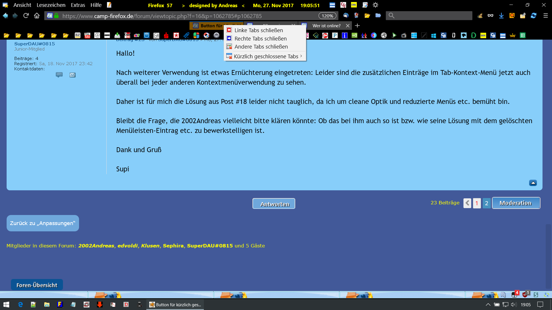 Das hier stand noch gar nicht au meiner todo-Liste, um dem ff57 wieder benutzbar zu machen, bin nur bei der Forumsrecherche allgemein darauf gestoßen. Eigentlich war ich gerade beim Entschlacken des Kontextmenüs und der Adressleiste etc. Habe ein paar Grundlagen den Stickys etc. entnommen... wobei ich bisher nicht weiß, wie ich script, code etc. von einander unterscheiden kann, um es an die richtige Stelle zu bringen. Das hier unter #18 ist ein script - richtig? Und das was man in die userChrome.css einfügt - wie nennt sich das - code?
