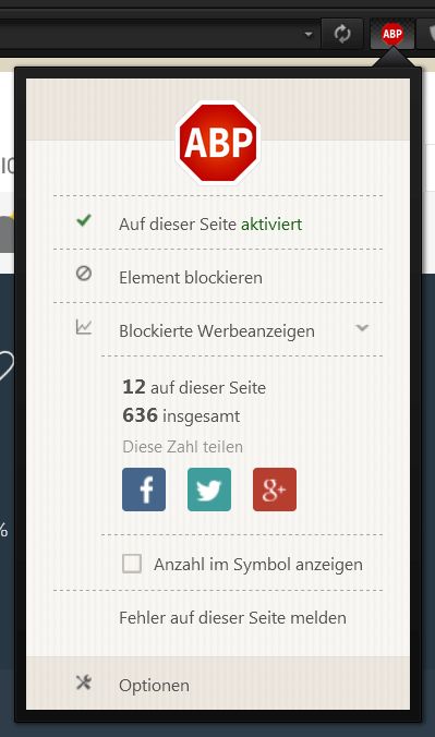 Dann installierte ich alle verfügbaren Adblocker. Sie zeigen sich genau so unbedienbar wie ABP. Habe keine Vorstellung, wie man das Problem erkunden kann. Eine Einstellung, die Adblocker ggf. global deaktivieren könnte, entdecke ich nicht.