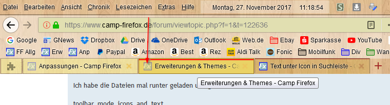 Die inaktiven Tabs sind hellgelb, außerdem sind die Favicons dort ausgeblasst. Bei "hover" auf die inaktiven Tabs werden diese etwas dunkler gelb. Ich hätte jetzt gerne, dass bei "hover" auch das Favicon wieder ohne Filter dargestellt wird, d.h. ohne dass es notwendig ist, das Favicon selbst zu "hovern", sondern es reicht, das inaktive Tab zu "hovern".