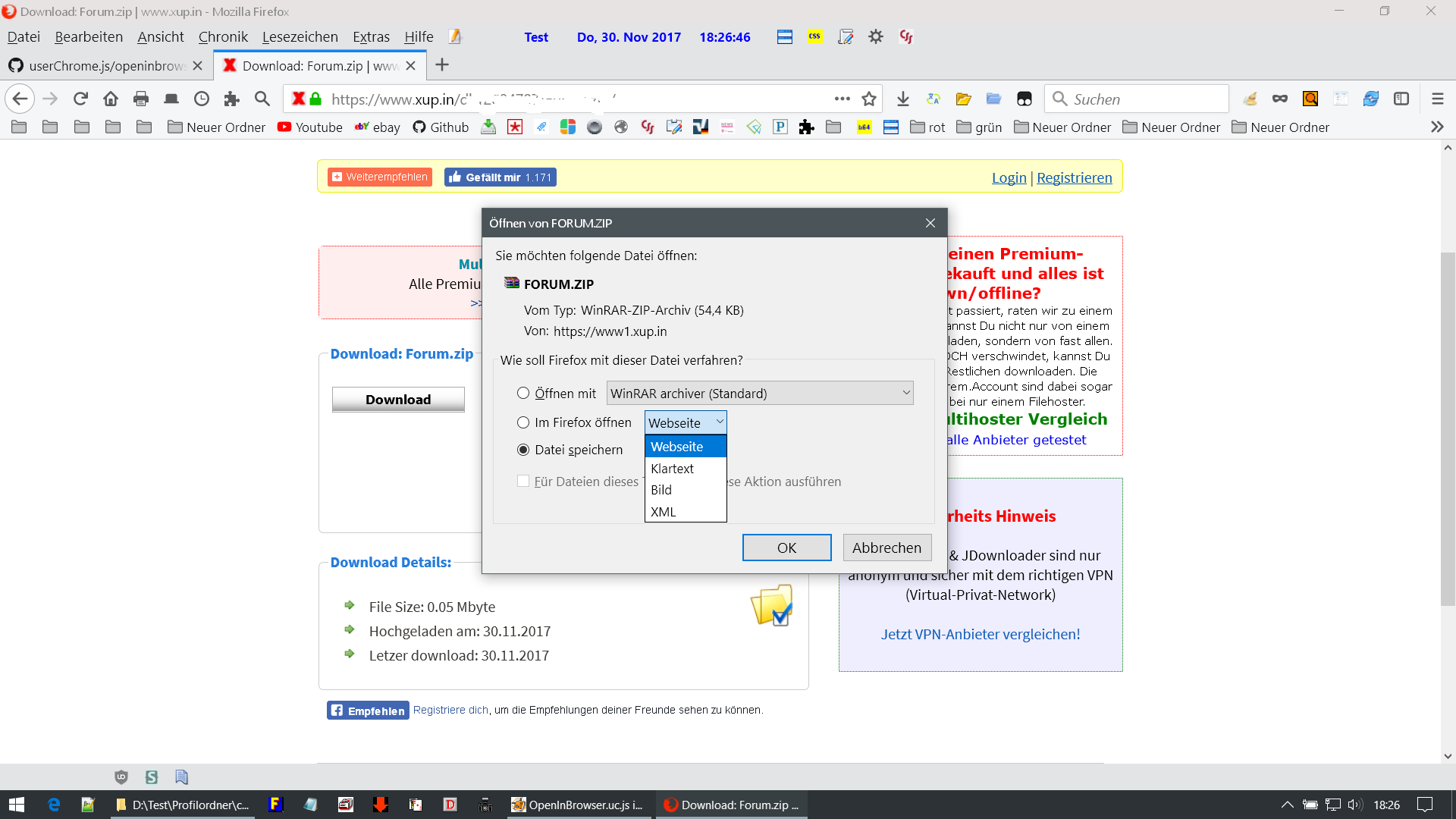 • Ich habe in den letzten Tagen an verschiedenen PCs mit jeweils neuen FF57-Installationen das OpenInBrowser-Script getestet. Es funktioniert leider überall nicht. Bzw nur partiell wie schon beschrieben.