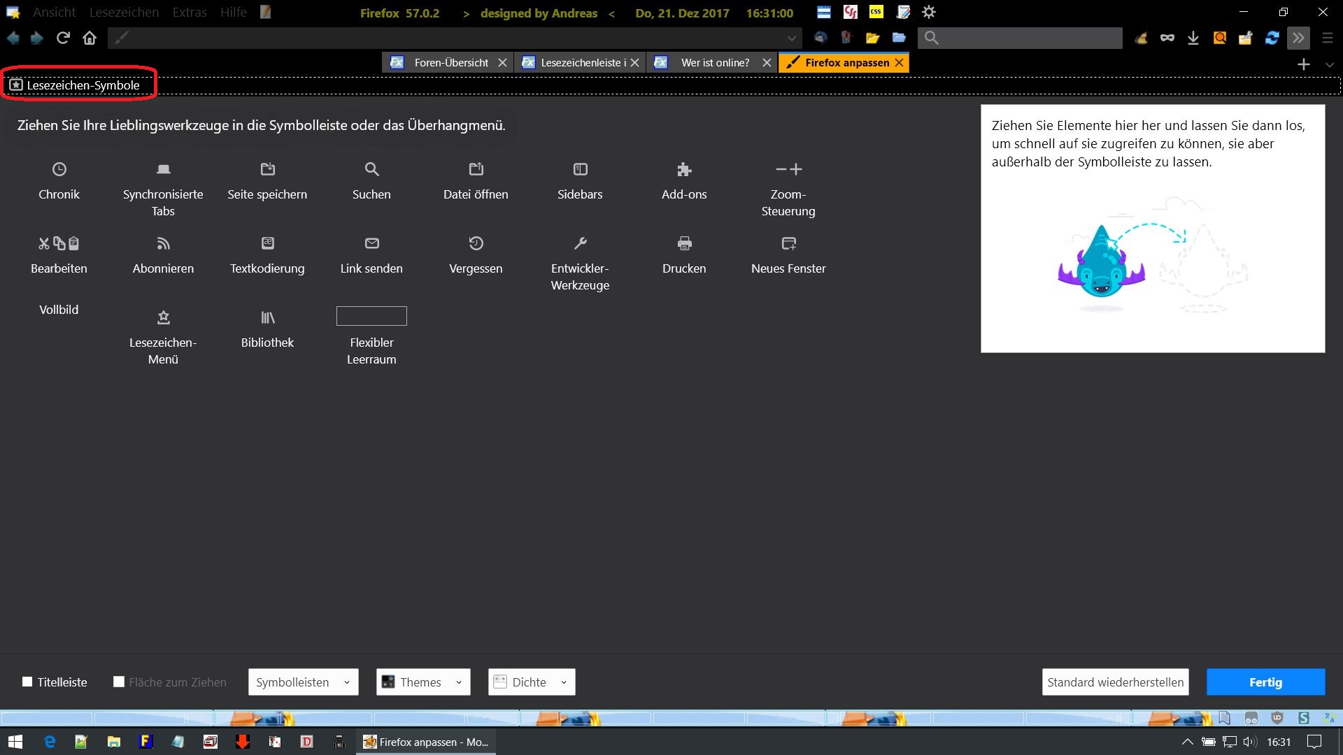 Plötzlich war die Leiste meiner Lesezeichen leer. Die Leiste an sich ist da, aber sie ist leer. Habe sie auch nochmal unter Ansicht aktiviert/ anzeigen lassen, habe auch den abgesicherten Modus mal gestartet und versucht, die Lesezeichen anzeigen zu lassen, aber sie sind weg. Ich vermute, eine versehentliche Tastenkombi hat das verursacht. Passiert mir neuerdings öfter, daß der Fox plötzlich irgendwas anderes macht, wenn ich grad am Tippen bin. ![]()