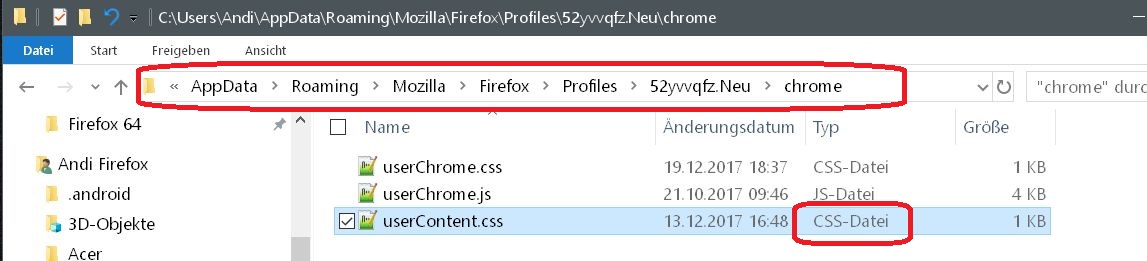 Meine userContent.css (und userChrome) Datei liegen im Profil-Ordner im Unterordner "chrome".