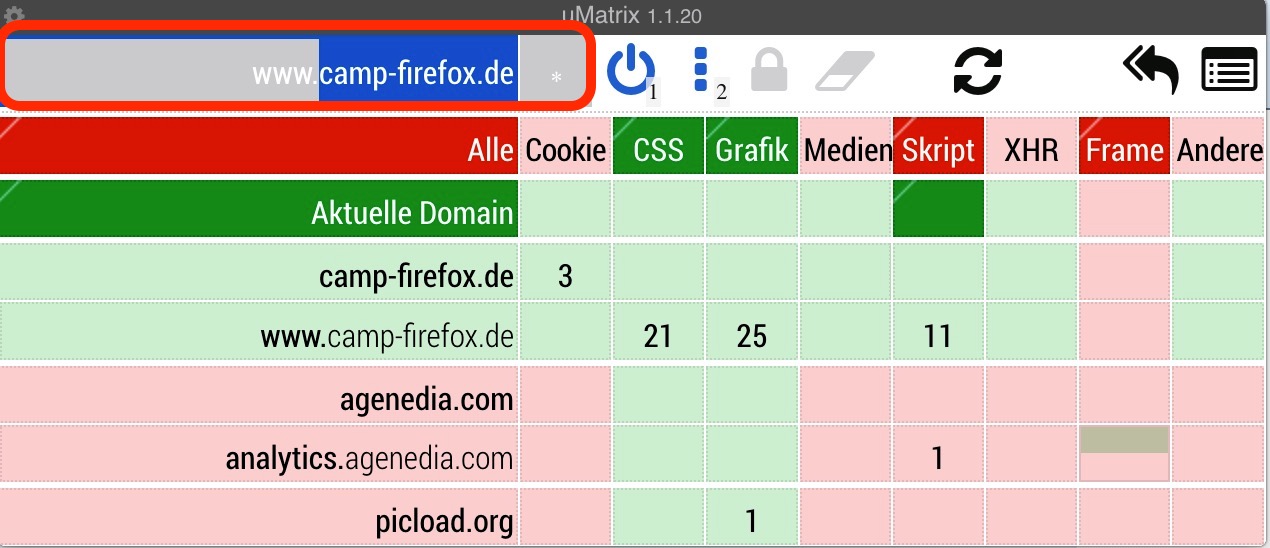 Ich war mir sicher, früher war uMatrix immer aktiviert, dh. eingeschaltet (Button blau) und es blockte alles was nicht zur Domain gehörte, alles halbwegs verdächtige.