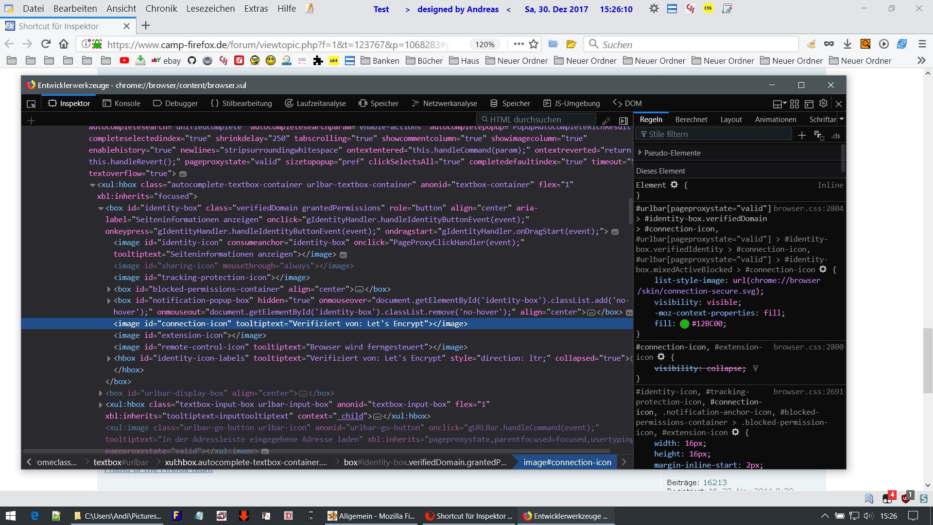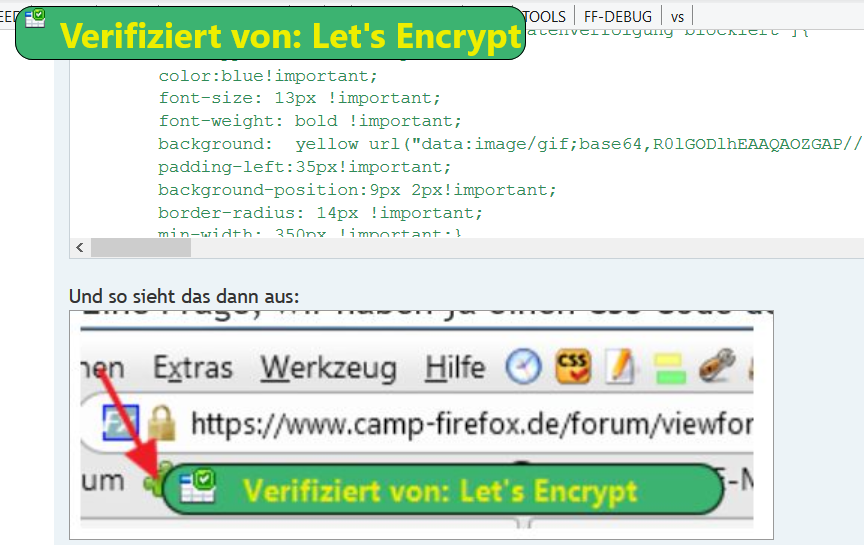 • Als was fungiert denn hier der Tooltip-String? Als Zuweisung oder ID? Der eigentliche String heißt "Verifiziert von: %S". %S steht für die Zertifizierungsstelle und die kann eine andere sein als "Let's Encrypt". Bei Mozilla-Seiten z. B. "DigiCert Inc", bei google.de "Google Trust Services". Bei einer Zuweisung wäre die Zertifizierungsstelle egal, bei einer ID-Funktion wäre das dann jeweils eine andere ID.