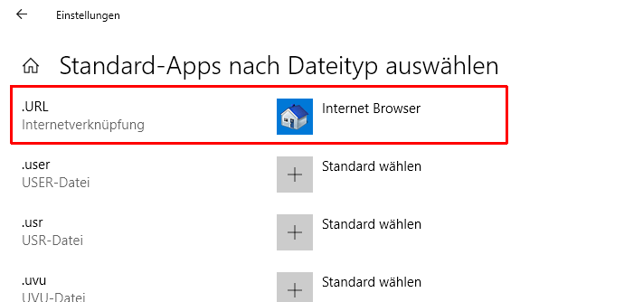 Einstellungen--> Apps--> Standard Apps-->runter scrollen zu -->Standard-Apps nach Dateityp auswählen--> nach .URL runter scrollen