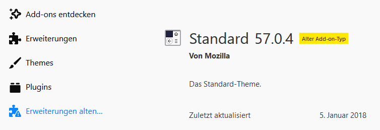 In der Folge habe ich bei dann eine angebliche "Erweiterung alten Types" in meiner Liste und zwar das "Standard-Theme", aktuell mit der 57.0.4.
