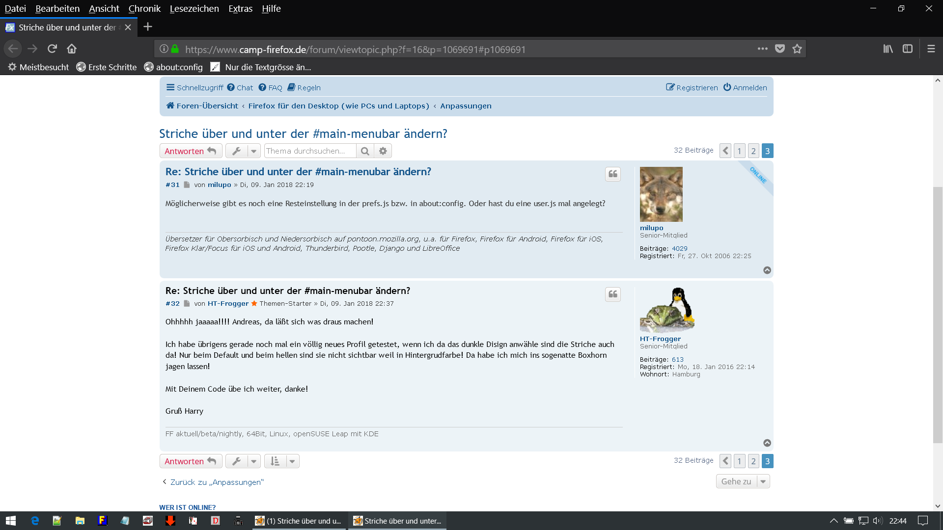 Auf einem Linux OS (HT-Frogger mit Suse, ich mit Debian) hat die Funktion -moz-appearance in Verbindung mit der Hintergrundfarbe manchmal keine oder eine unerwünschte Auswirkung.