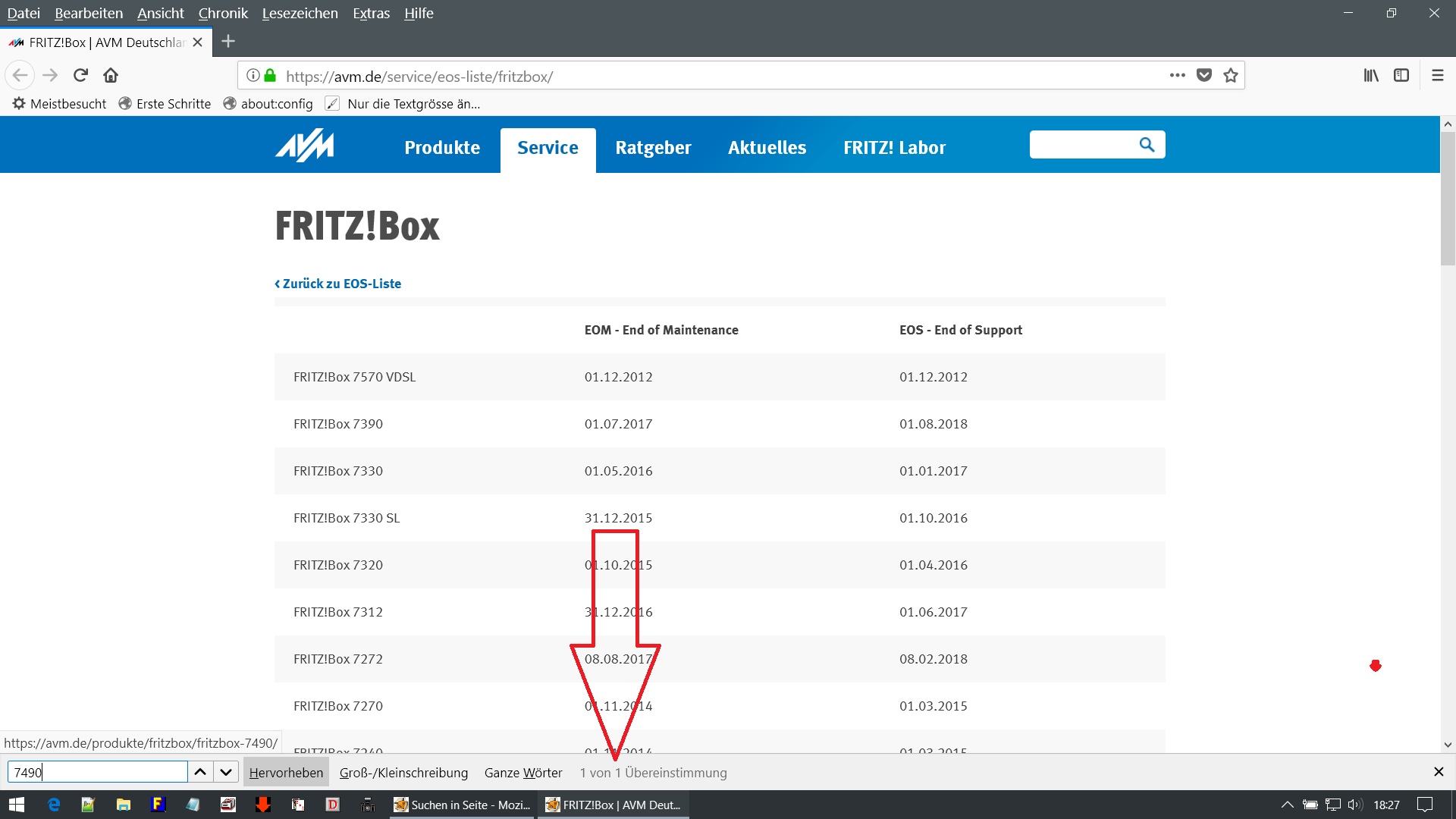 Wenn ich mit FF 56.0 und 57.1 auf der Seite https://avm.de/service/eos-liste/fritzbox/ nach 7490 mit Strg-F suche, wird mir eine Fundstelle angezeigt, ich kann aber keinen Eintrag sehen (und es wird auch nichts hervorgehoben). Warum?