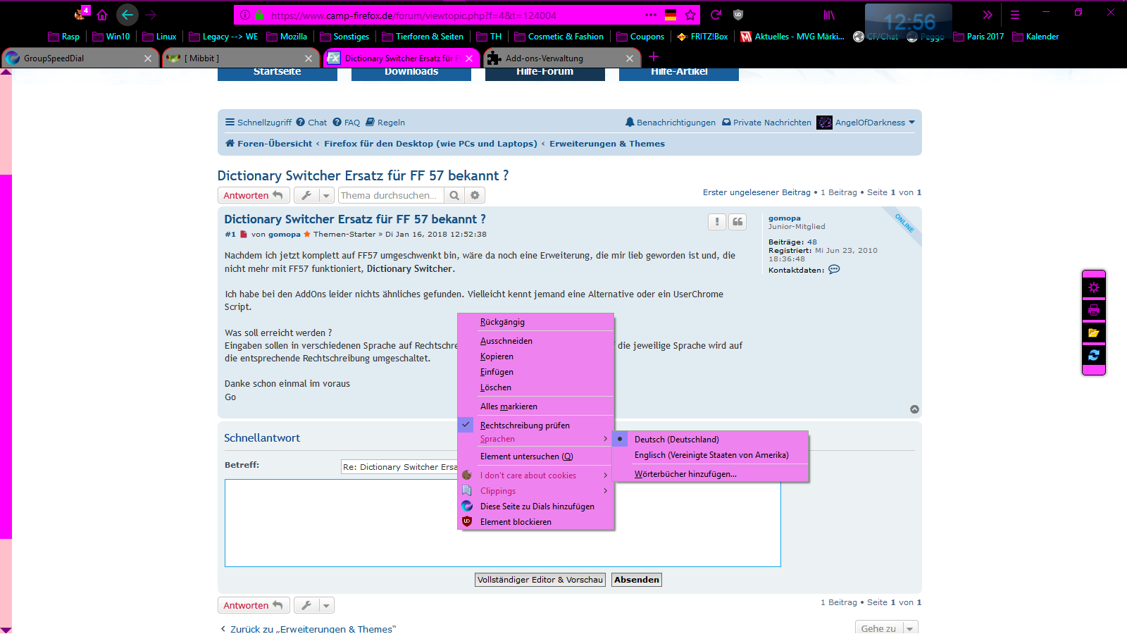 Nachdem ich jetzt komplett auf FF57 umgeschwenkt bin, wäre da noch eine Erweiterung, die mir lieb geworden ist und, die nicht mehr mit FF57 funktioniert, Dictionary Switcher.