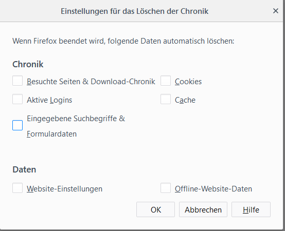 Gegebenenfalls musst Du zuerst unter Chronik einstellen dass Firefox die Chronik nach benutzerdefinierten Einstellungen anlegen soll, damit die anderen Optionen sichtbar werden.