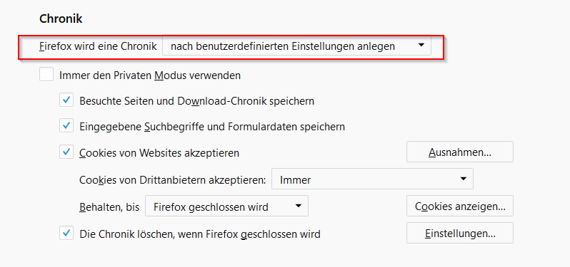 Gegebenenfalls musst Du zuerst unter Chronik einstellen dass Firefox die Chronik nach benutzerdefinierten Einstellungen anlegen soll, damit die anderen Optionen sichtbar werden.