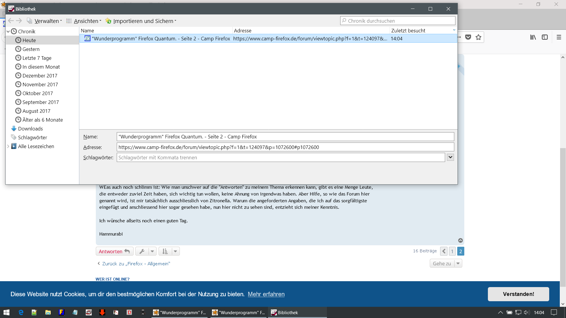 Heute gibt es nur noch zu wählen zwischen gestern und heute, manches Mal macht er folgendes: Ich rufe die Chronik auf und sehe links "Heute" und "Gestern". Nicht nur, dass die Angaben, die dann kommen, bei weitem nicht vollständig sind. 5 Minuten später rufe ich wieder die Chronik auf, weil ich das vorherige nicht glauben wollte. Was passiert? Es wird nur noch "Heute" angezeigt und dies nur sehr rudimentär.