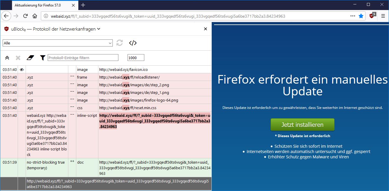 Das gesamte Fenster will vom Erscheinungsbild her glauben machen dass es original ein Forefox Fenster ist. In der Mitte des Fensters steht groß geschrieben: "Firefox erfordert ein manuelles Update"