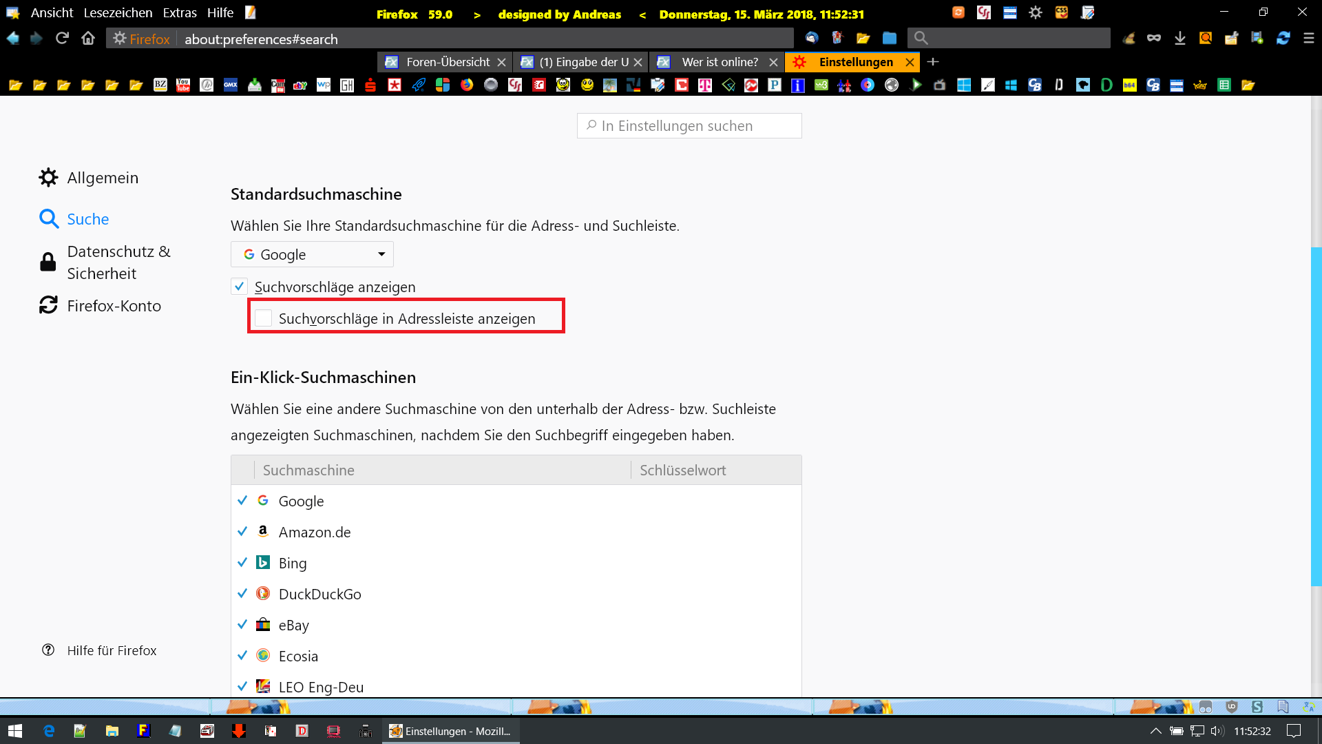 Beide Haken wieder entfernt, dann begann das Dilemma. Denn es wurden trotzdem Suchvorschläge angezeigt.