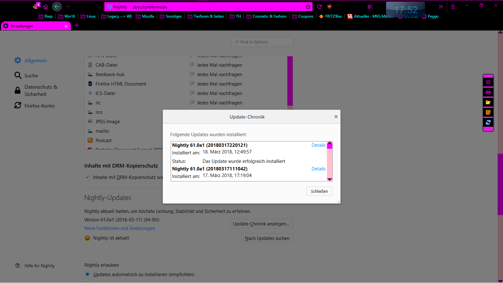 Wie updated ihr denn ? Wenn ich (vom heutigen Stand aus, vorher konnte ich nicht) versuche über das automatische Updatesystem (nightly-channel) ein Update einzuspielen, dann wird mir gesagt Firefox sei aktuell (Build ID 20180317220121) . Siehe Bild
