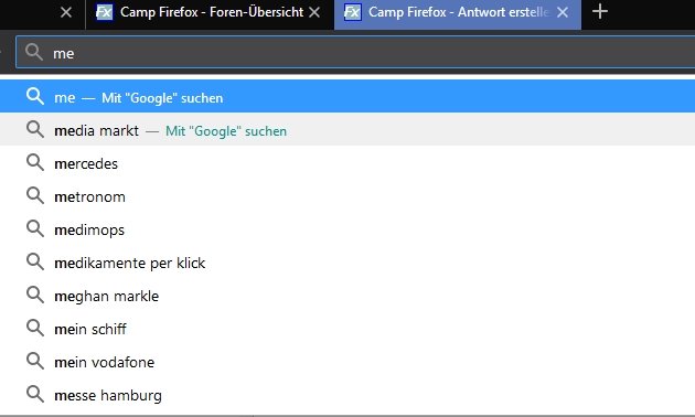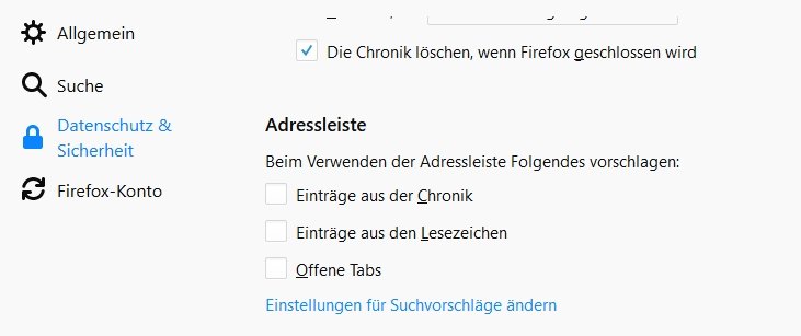 Sowie unter Einstellungen---> Datenschutz und Sicherheit-->Adressleiste-->Beim Verwenden der Adressleiste Folgendes vorschlagen: Haken raus bei: "Einträge aus der Chronik" und "Einträge aus den Lesezeichen" und "Offene Tabs"