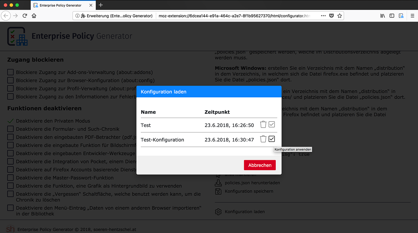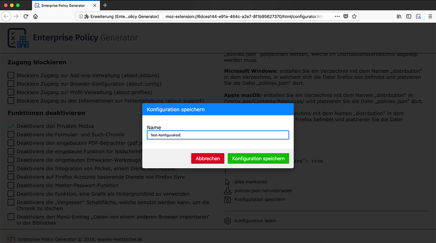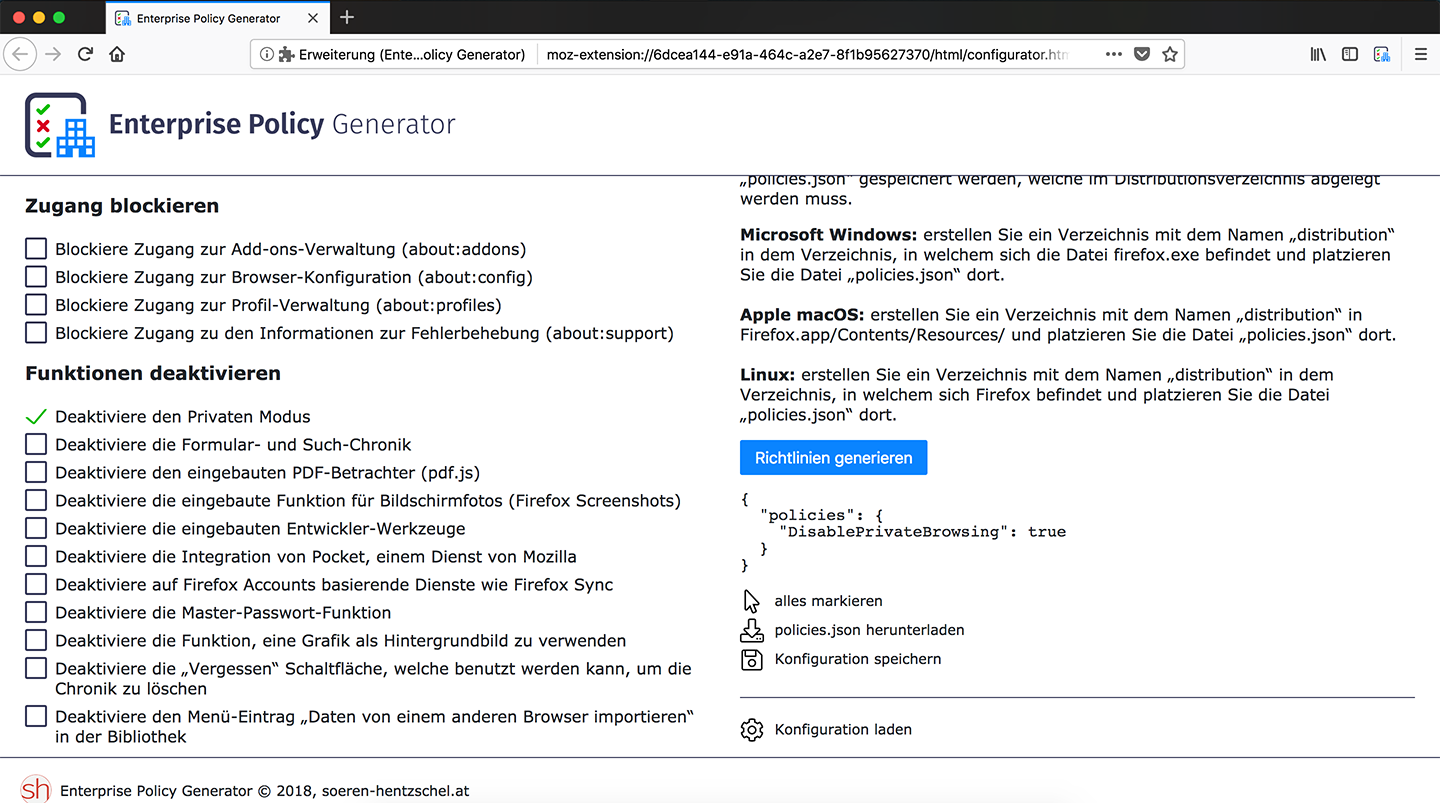 In dem konkreten Fall könnte ich auf diese Option vermutlich verzichten, wenn ich die Option zum Standard mache, die der Standard-Funktion von Firefox entspricht, d.h. dass die Regel zwar immer mit aufgenommen wird, wenn der Haken gesetzt wird, aber die Standard-Vorgabe des Policy Generators de facto nichts ändert.