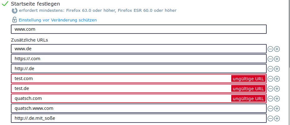 Der Enterprise Policy Generator hat bereits eine Validierung von Pflichtfeldern besessen. Neu in Version 3.0.0 ist eine zusätzliche Validierung von URL-Feldern. Nach ausführlichen Tests mit verschiedenen Validierungs-Ansätzen wurde sich für den simpelsten aller Ansätze entschieden: es findet lediglich eine Validierung des Protokolls statt, das heißt, URLs müssen mit https:// oder http:// beginnen. Auf diese Weise soll sichergestellt werden, dass die Konfiguration bei speziellen, aber gültigen URLs nicht an einer Validierung scheitert, die es besonders genau zu nehmen versucht. Leider ist die Validierung aller möglichen URLs eine Wissenschaft für sich, weswegen sich für diese Erweiterung für die sichere Variante entschieden worden ist.