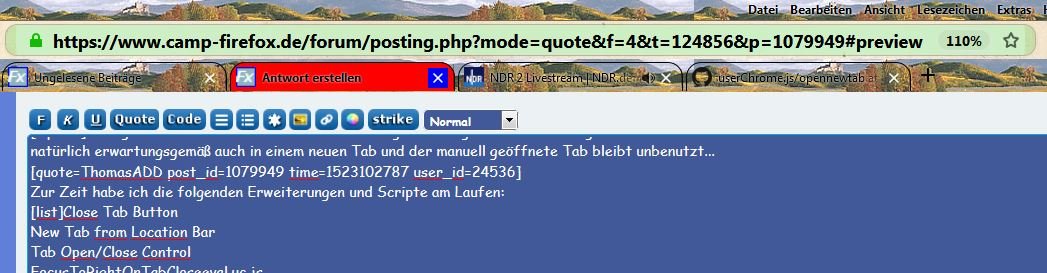 • Ich habe die user.js von Sören übernommen, alle Erweitungen deaktiviert, die bisherigen uc.js Dateien verschoben und die openNewTab.uc.js runtergeladen.
