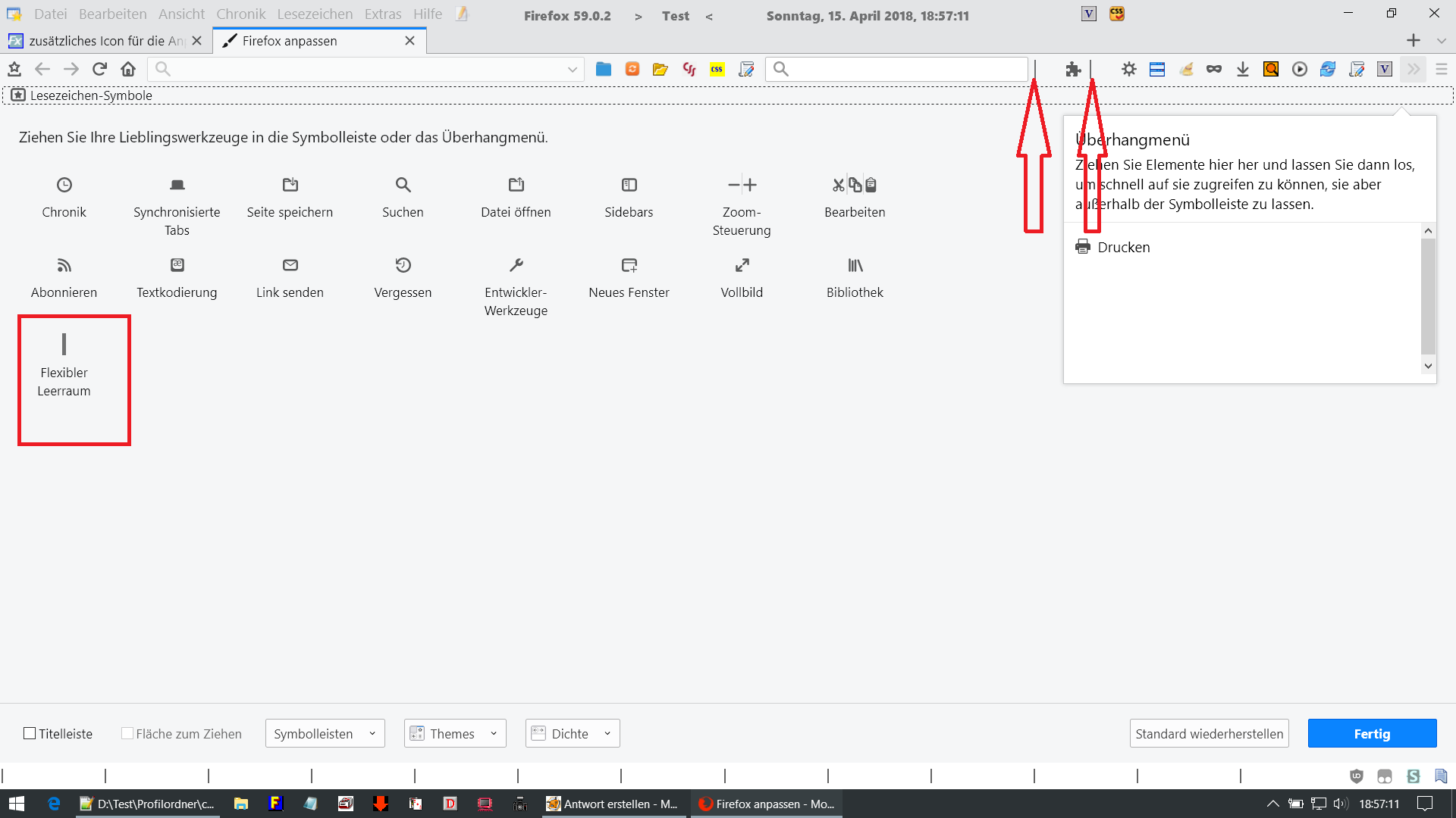 ich musste meinem Fuchs mal 'n von Grund auf neues Profil verpassen und stelle jetzt fest, dass ich die Icon-Abstände in der Adress-Symbolleiste nicht mehr so wie vorher einfach durch geschicketes Verschieben geringfügig vergrößern/verkleinern kann. Auch der Abstand zwischen Icons und dem Adressfeld ist entweder "riesig" (mit dem flexiblen Zwischenraum) oder ganz eng.