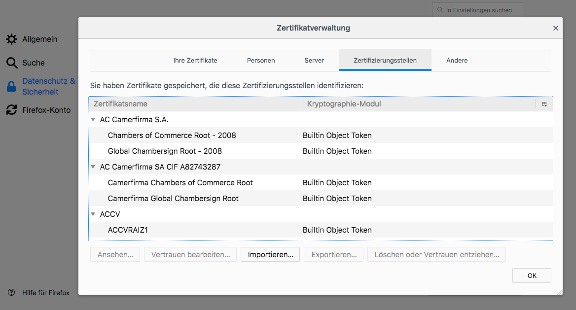 kann mir einer sagen, was das in der Firefox Zertifikatverwaltung alles für Zertifikate sind? Wie kommen die da alle hin? Und welchen Zweck erfüllen sie? Habt ihr da auch so viele?