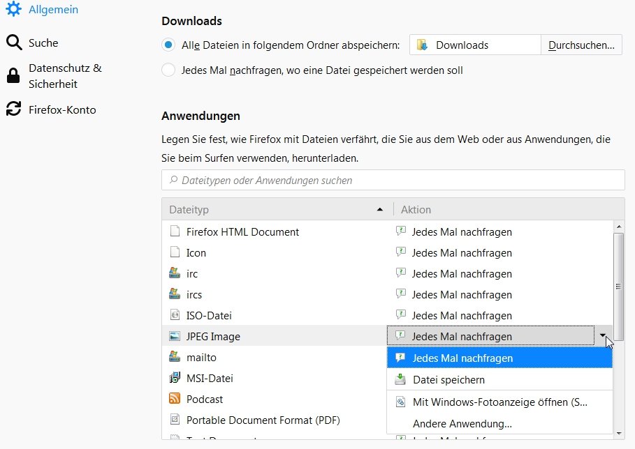 in einem Forum bekomme ich die jpg Bilder immer mit VLC angezeigt. Wenn ich auf Anwendung wählen gehe, kann ich etwas aussuchen, bei mir wäre der Favorit Ristretto. Aber ich muß das jedesmal aufs neue auswählen, der Knopf "Für Dateien dieses Typs immer dieser Anwendung wählen" ist ausgegraut. In den Einstellungen sehe ich auch keine Möglichkeit das festzulegen.