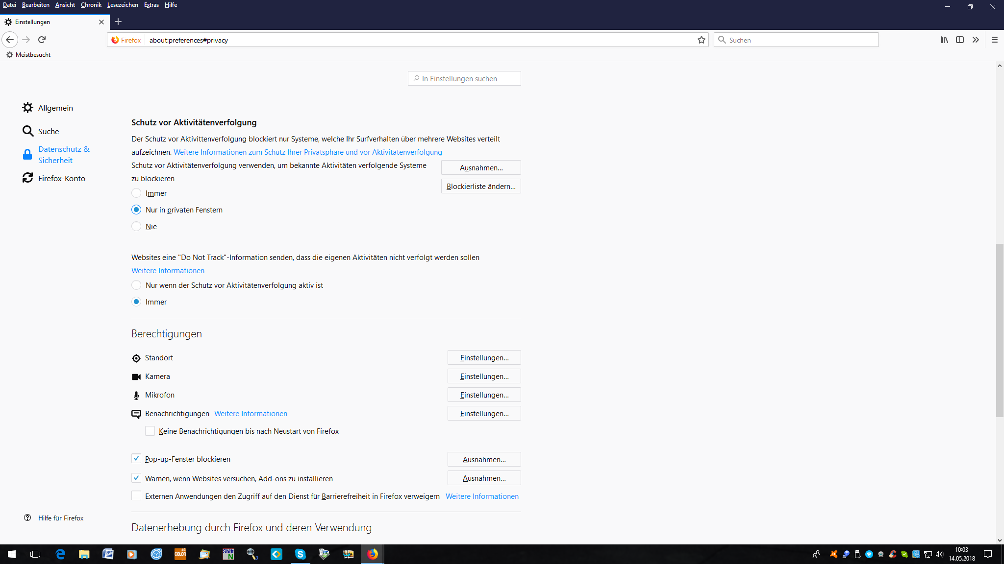In die Adressleiste about:preferences#privacy eingeben, mit Enter bestätigen.