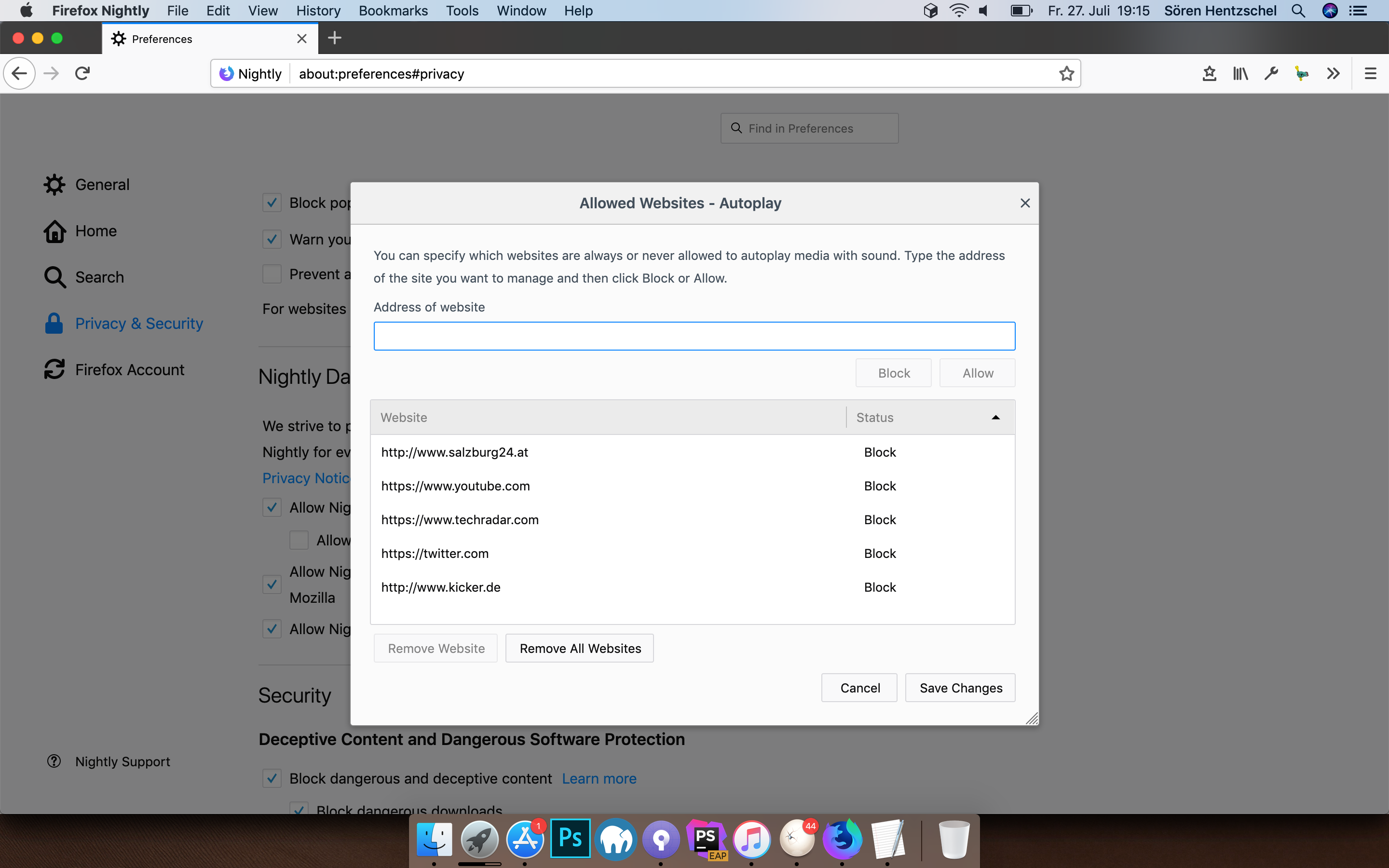 En kleiner Knackpunkt ist aber noch, wo ich hoffe, dass Oleksandr da noch eine bessere Lösung findet. Wenn man nämlich nach der Installation auf das Symbol der Erweiterung in der Symbolleiste klickt, erscheint die Länderliste - allerdings noch in Englisch. Derzeit muss man noch auf irgendein Land klicken, um in das Fenster mit den dazugehörigen Sendern zu gelangen und dort auf das Einstellungssymbol (das Zahnrädchen) klicken und die gewünschte Sprache in den Einstellungen auswählen. Im Add-on-Manager gibt es für diese Erweiterung kein Einstellungsfenster.