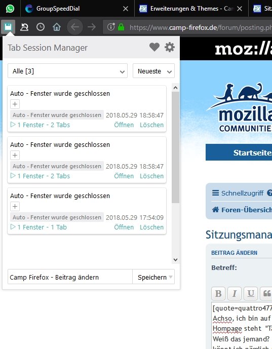 • Oh das klingt gut, danke für das "Angebot". Ich möchte ja auch gern die neueste und sicherste Firefox Version nutzten aber weil damals nichts mehr funktionierte bzw.nicht mehr so wie gewohnt/vorher..., drum bin ich erstmal bei der alten Version geblieben bzw. hab wieder zurückgewechselt. Also das erste was mir einfällt sind halt meine gespeicherten Sitzungen. Oben links hab ich so ein Symbol, keine Ahnung wie ich es beschreiben soll, unten ein kleiner Kasten mit sowas wie ner Leuchte oben drauf, weißt vieleicht was ich meine. Dort gehen meine ganzen gespeicherten Sitzungen auf. Das würd ich so auch gern weiter nutzten wollen. Kann die Tab Mix Plus-Erweiterung das?