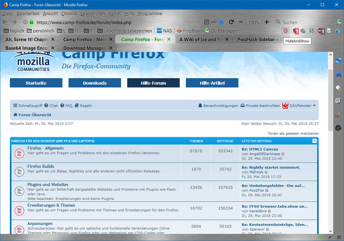 Aber manchmal will man halt einfach nur surfen und nicht basteln, daher habe ich mir ein Script gebastelt mit dem man Elemente mittels ihrer ID flexibel ein- und ausblenden kann, aktuell sind nur die beiden obigen Toolbars betroffen, aber es lassen sich leicht weitere IDs hinterlegen.