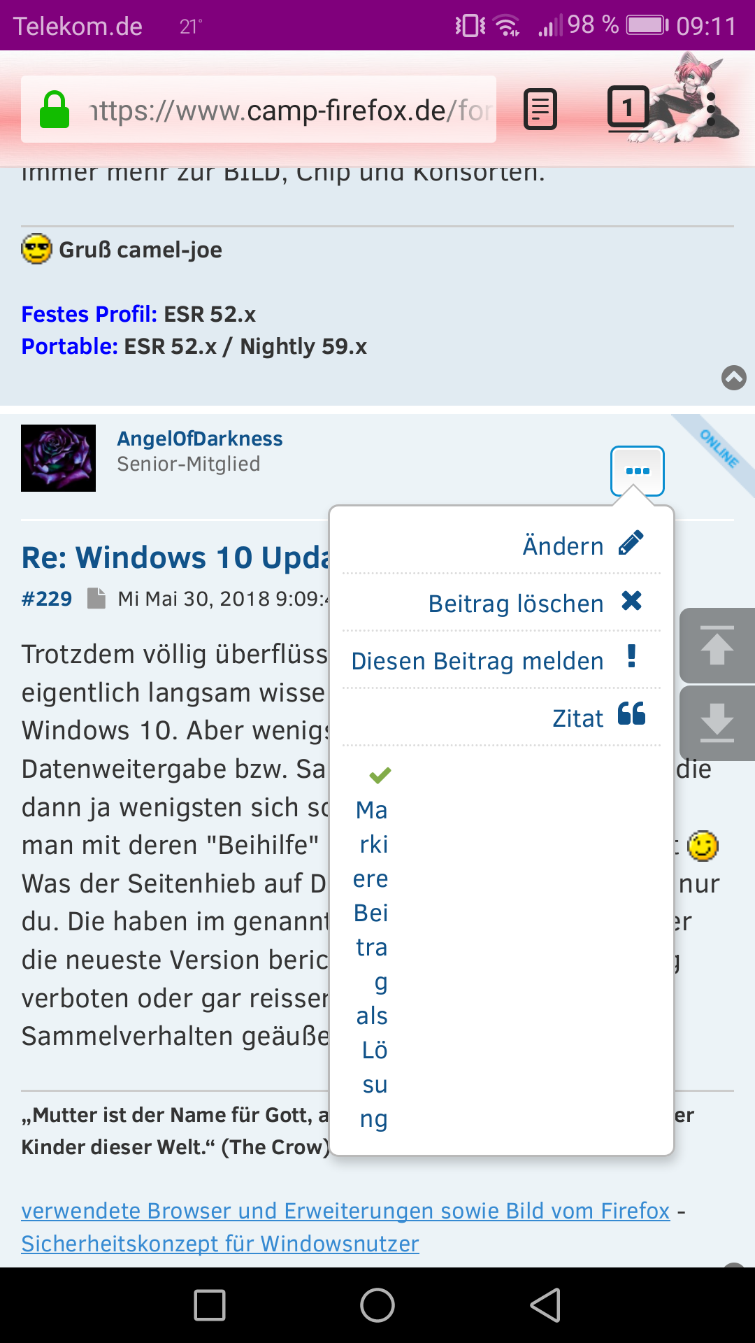 ich wollte mal nachfragen, ob es seit gestern irgendwelche Änderungen in der Mobilen Version des Forums gegeben hat. Denn irgendwie bekomme ich nun bei einem von mir gesendeten Beitrag nur noch ein drei Punkte Button, vorher waren für jede Option einer da. Sprich Ändern, Löschen etc...