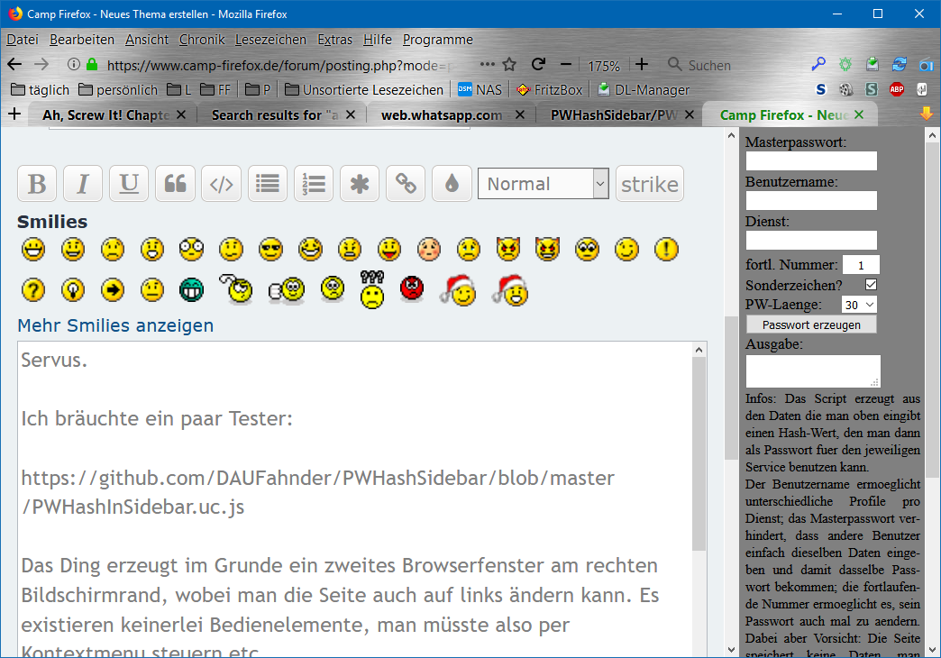 Darüber kann man irgendwann mal nachdenken. Aber die Sidebar war und ist eher als eine bequeme Lösung für meinen PW-Generator gedacht. Bisher hatte ich das Ding immer in einem zweiten Tab offen, das geht jetzt deutlich bequemer. Und einen Fehler hab ich auch schon gefunden und behoben. Der andere muss warten. Aktuell spinnt noch die Seitenzuweisung rum, wenn beim Firefox-Start eine "echte" Sidebar aktiv ist, da "appendChild." mit der Reihenfolge durcheinander kommt. Ich muss also einen entsprechenden Check einbauen... demnächst.