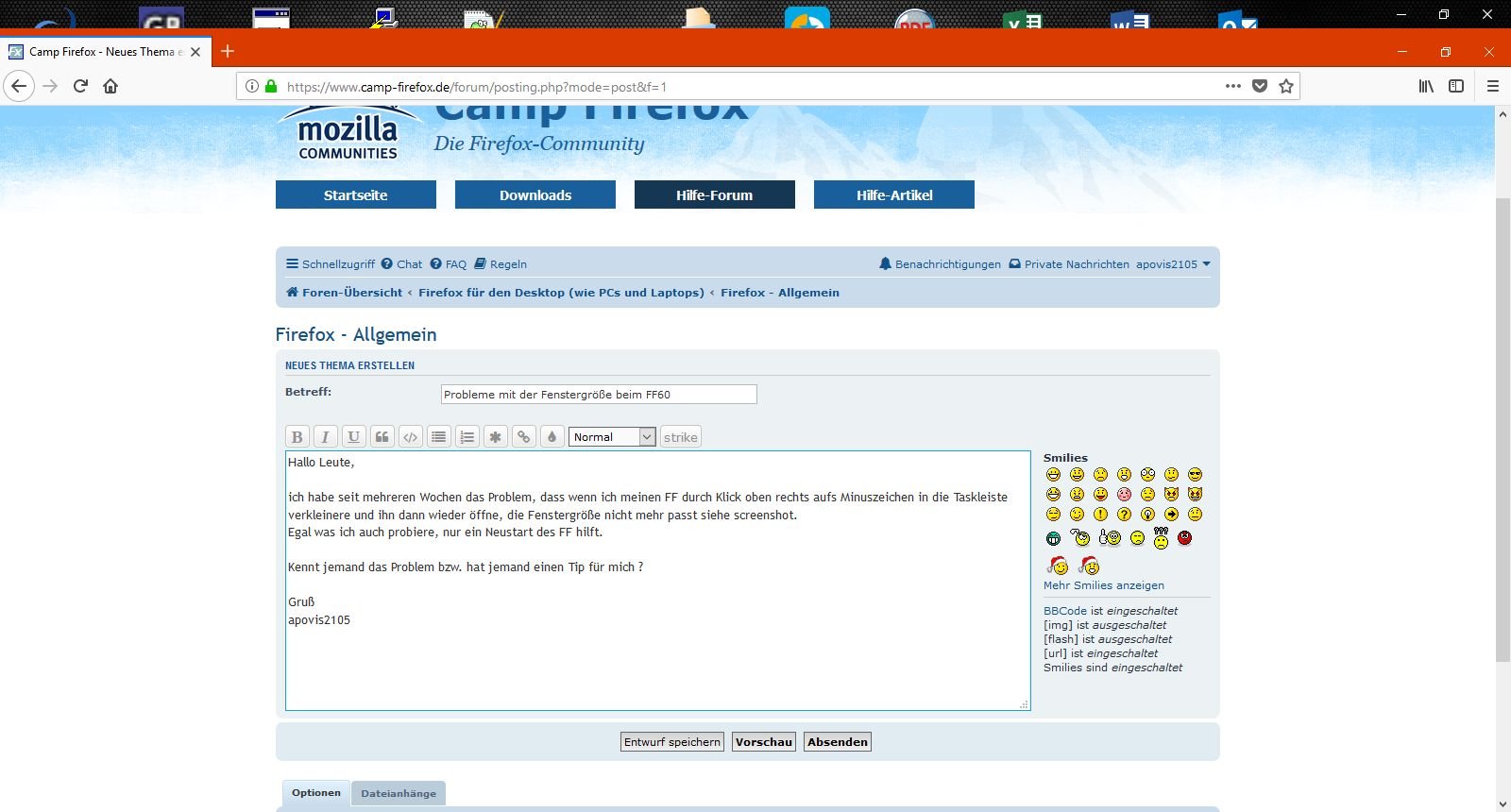 ich habe seit mehreren Wochen das Problem, dass wenn ich meinen FF durch Klick oben rechts aufs Minuszeichen in die Taskleiste verkleinere und ihn dann wieder öffne, die Fenstergröße nicht mehr passt siehe screenshot.