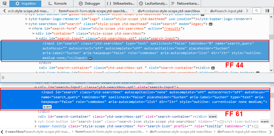 Ergänzung: ich habe mal nen Screenshot gemacht mittels Inspektor für das Suchfeld auf Youtube bei Firefox 44 und Firefox 61.