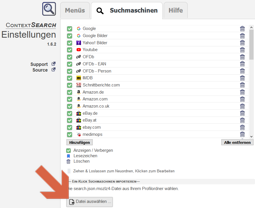 Von dort kannst du fertige Suchen bzw. Suchmaschinen in den Firefox importieren. Danach die Suchmaschinen neu in ContextSearch web-ext einladen und testen.....