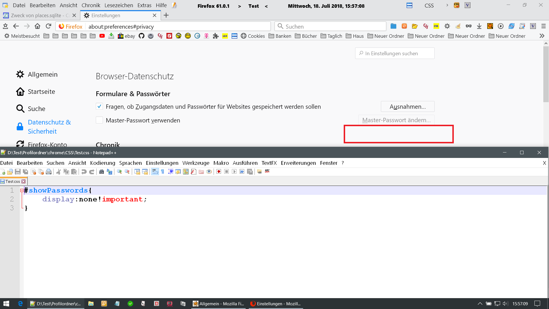 ich versuche verzweifelt das Feld "Passwörter Anzeigen" unter Extras, Einstellungen, Datenschutz & Sicherheit, gespeicherte Zugangsdaten auszublenden, sodass man keine Möglichkeit mehr hat sich die gespeicherten Passwörter anzeigen zu lassen? Weiss jemand wie dies funktioniert? Ich habe eine Möglichkeit über Änderung der Datei userChrome-example.css im Internet gefunden aber leider funktioniert dies mit der aktuellen Version nicht mehr. Vielen Dank im Voraus