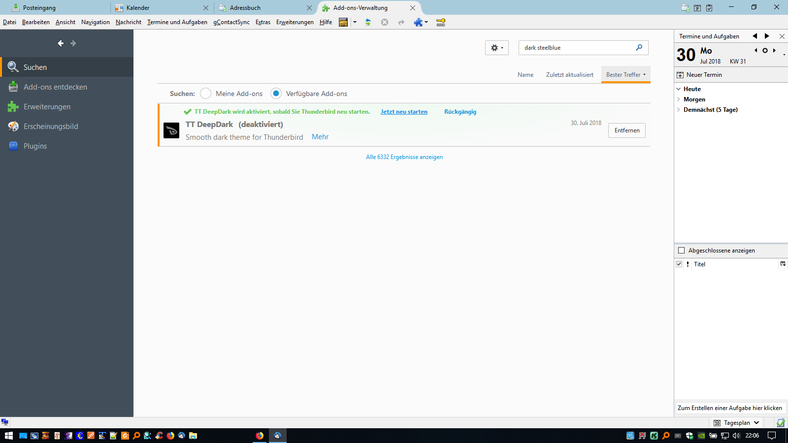 • geldhuegel: Auf deinen Screenshots steht nicht Dark Steelblue, sondern TT DeepDark. Das ist ein anderes Theme. Dark SteelBlue gibt es, ich habe es ja installiert. Du kannst nicht ein Theme einfach durch ein anderes ersetzen. Wenn ich im Add-on-Manager Dark SteelBlue ins Suchfeld eingebe, finde ich nichts, ich muss auf den Link gehen, der mich zu allen Themes auf addons.thunderbird.net führt, siehe meinen Beitrag #25 in dem grauen Kasten.