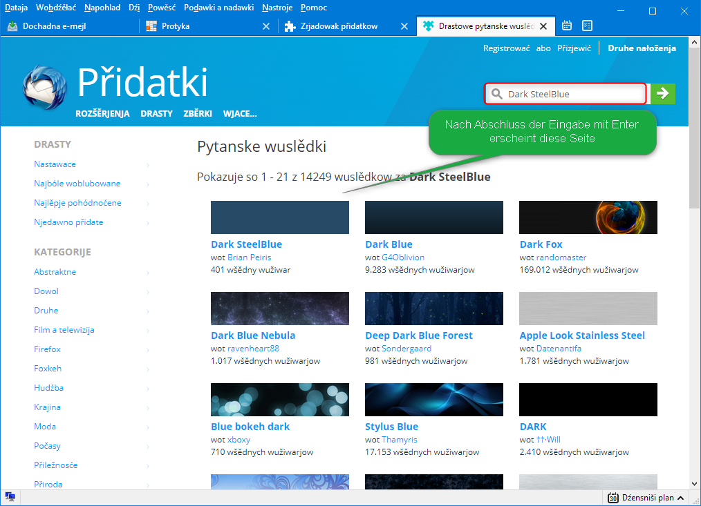 Wenn ich im TB Extras/Addons aufrufe, Erscheinungsbild wähle und im Suchfenster Dark Steelblue eingebe und Enter drücke erhalte ich diese Seite: