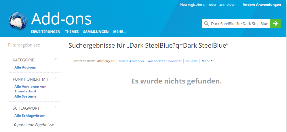 Wenn ich im TB Extras/Addons aufrufe, Erscheinungsbild wähle und im Suchfenster Dark Steelblue eingebe und Enter drücke erhalte ich diese Seite: