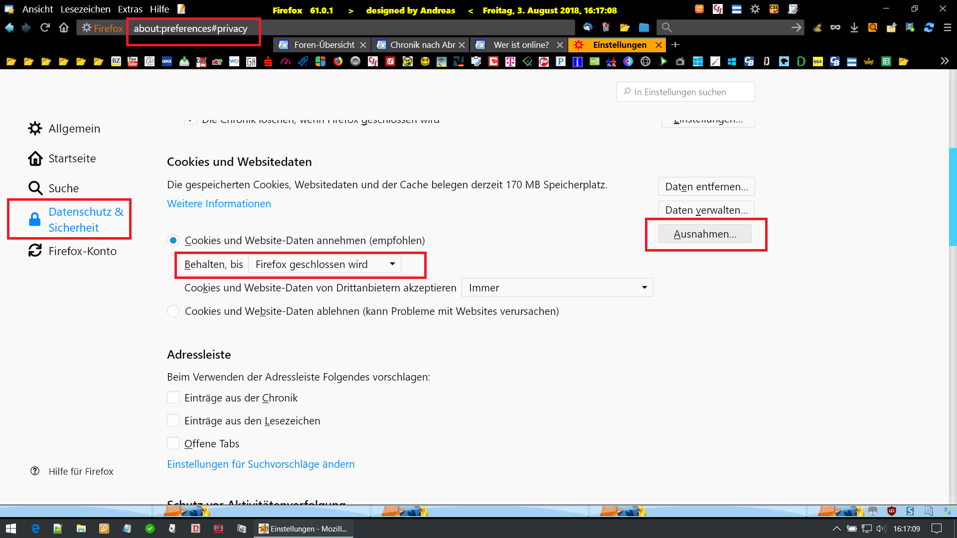 ich habe es eingerichtet, dass nach dem Herunterfahren meines Rechners die gesamte Chronik (Cache, Cookies etc.) gelöscht wird.