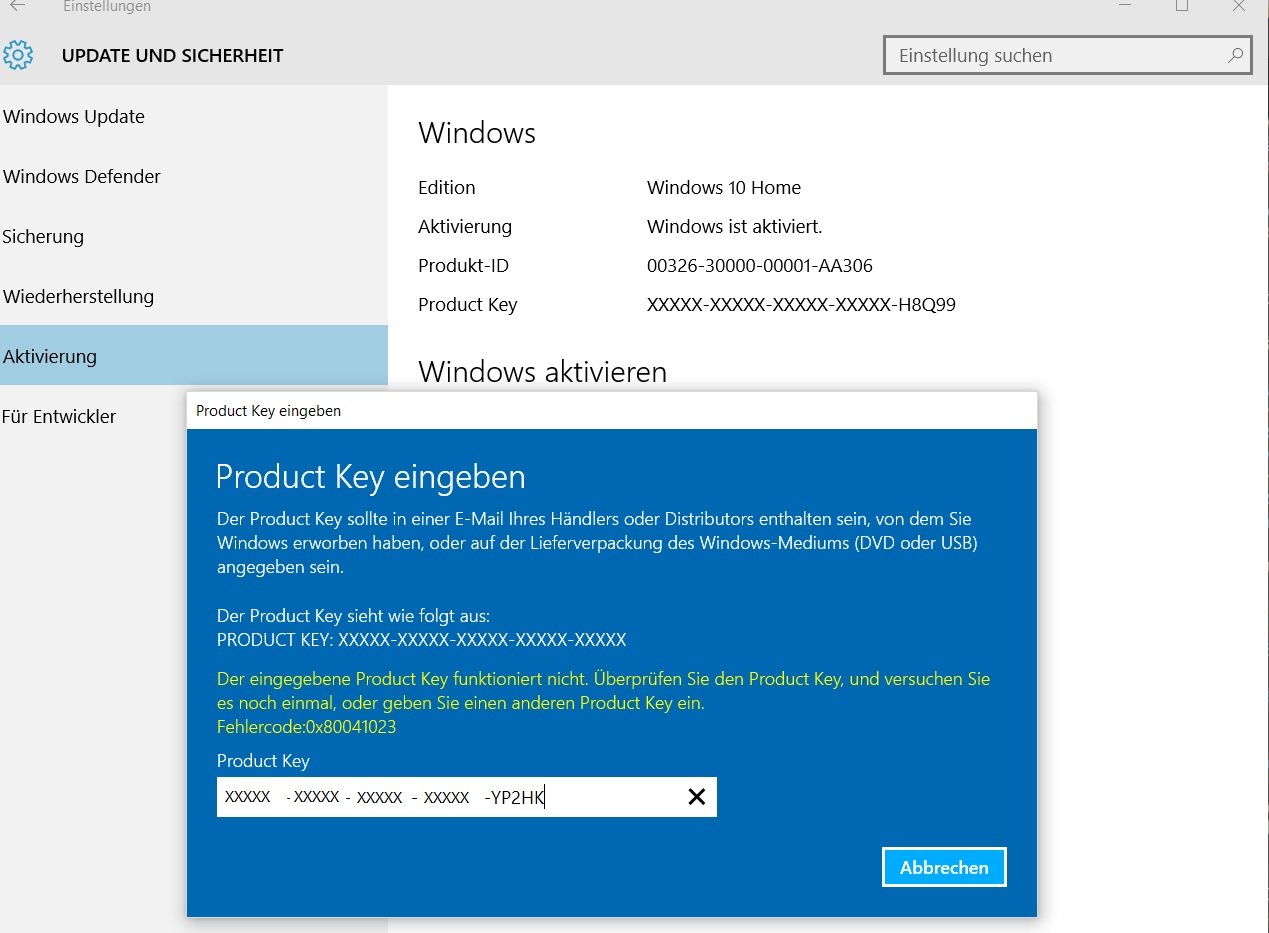...diese letzte Buchstaben- u. Zahlen-Folge erscheint auch auf dem Screenshot im Thread Nr. 12 -> 'Einstellungen -> Update und Sicherheit -> Aktivierung -> bei Product Key...